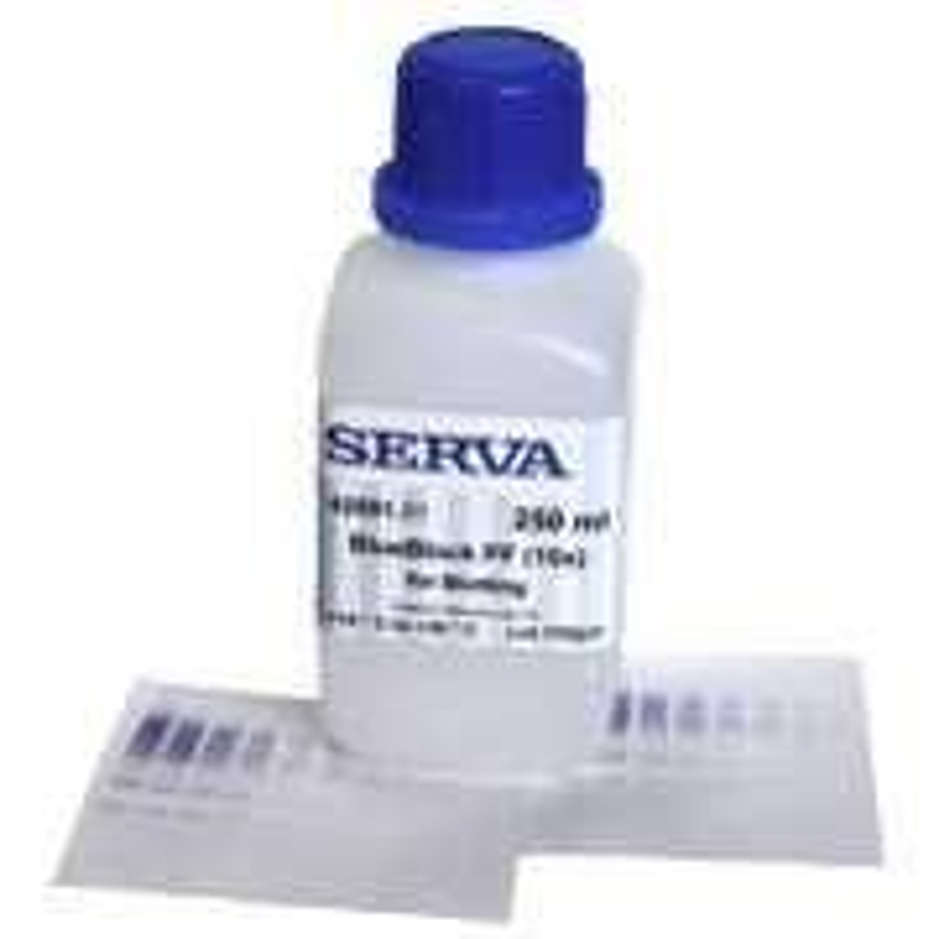 Protein-free, polymer-based blocking reagent for fast blocking without loss of sensitivity in colorimetric, chemiluminescence, and fluorescence detection systems. The All-in-One protocol allows completion of procedure in only 1–2 hours. To achieve a good signal-to-noise ratio in blotting, ELISA, or other immunoassays, it is important to block nonspecific antibody binding sites. Protein-based blocking solutions like skim milk or BSA solutions may not only block unspecific binding sites but also mask specific binding sites. With BlueBlock, the specific binding sites remain accessible while nonspecific reactions are suppressed, thus leading to an increase in signal intensity.
