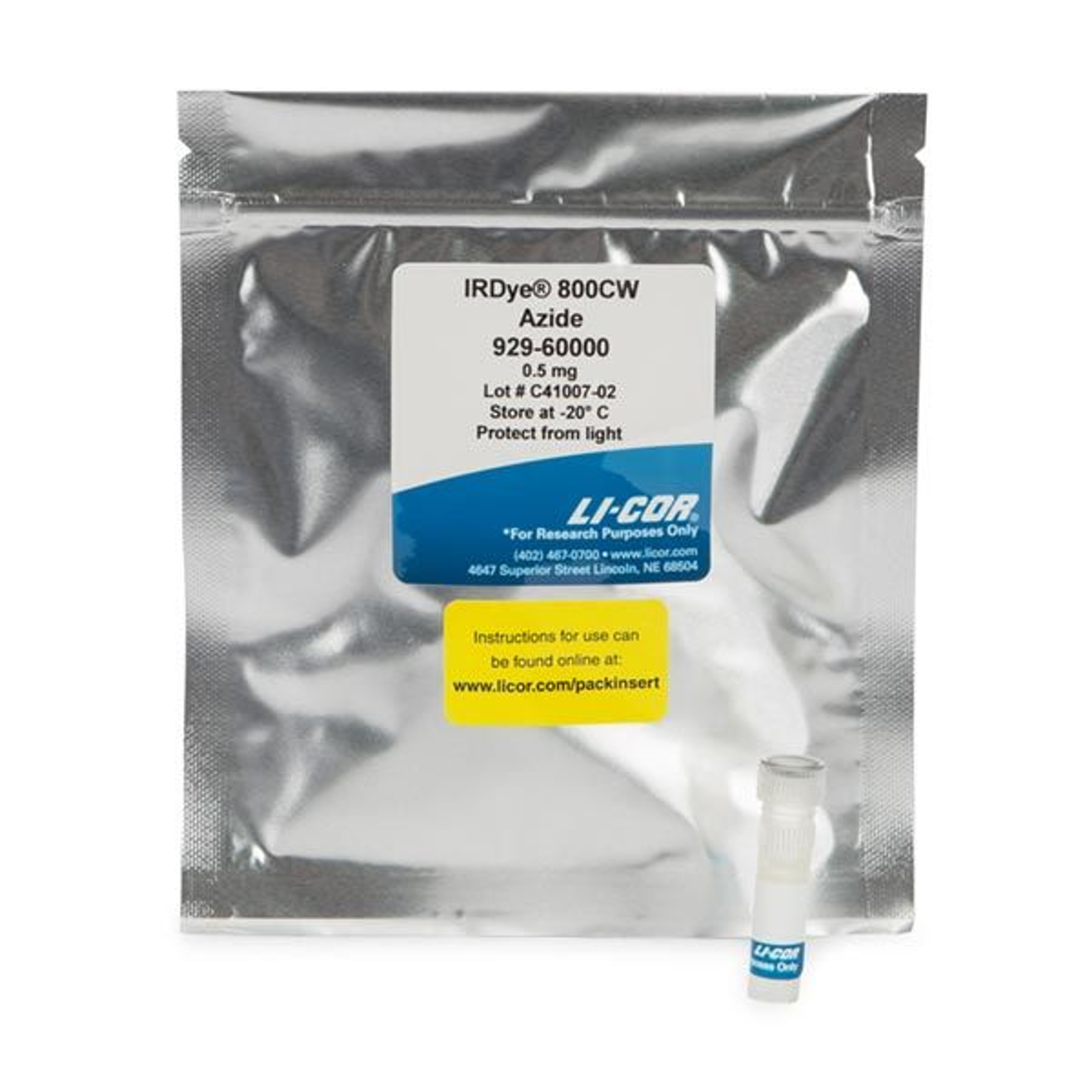 IRDye 800CW Azide provides the functionality for preferential labeling of molecules that contain either the alkyne or dibenzocyclooctyne (DBCO) group.