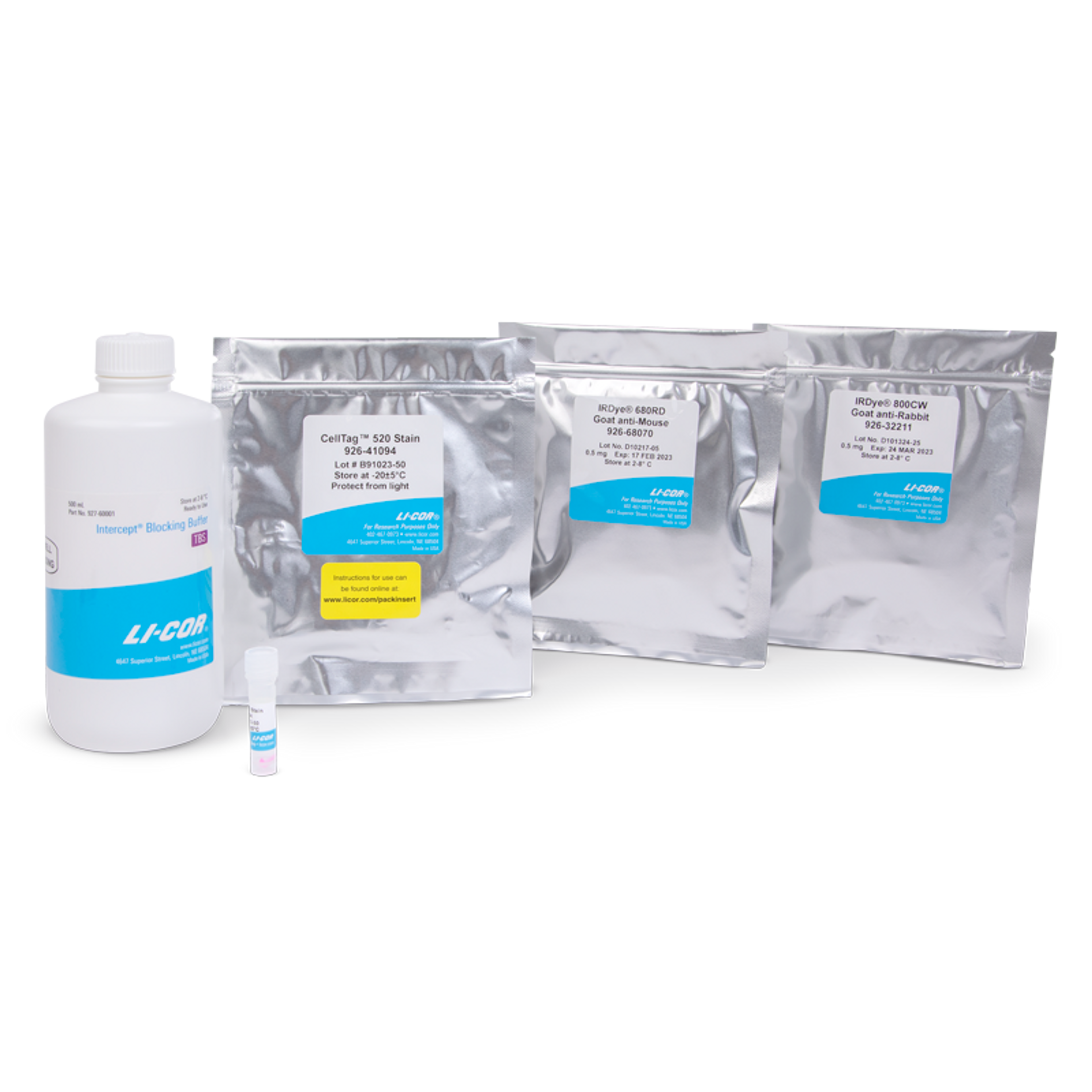 This kit includes reagents to perform an In-Cell Western Assay and CellTag 520 Stain to normalize well-to-well variations in cell number.