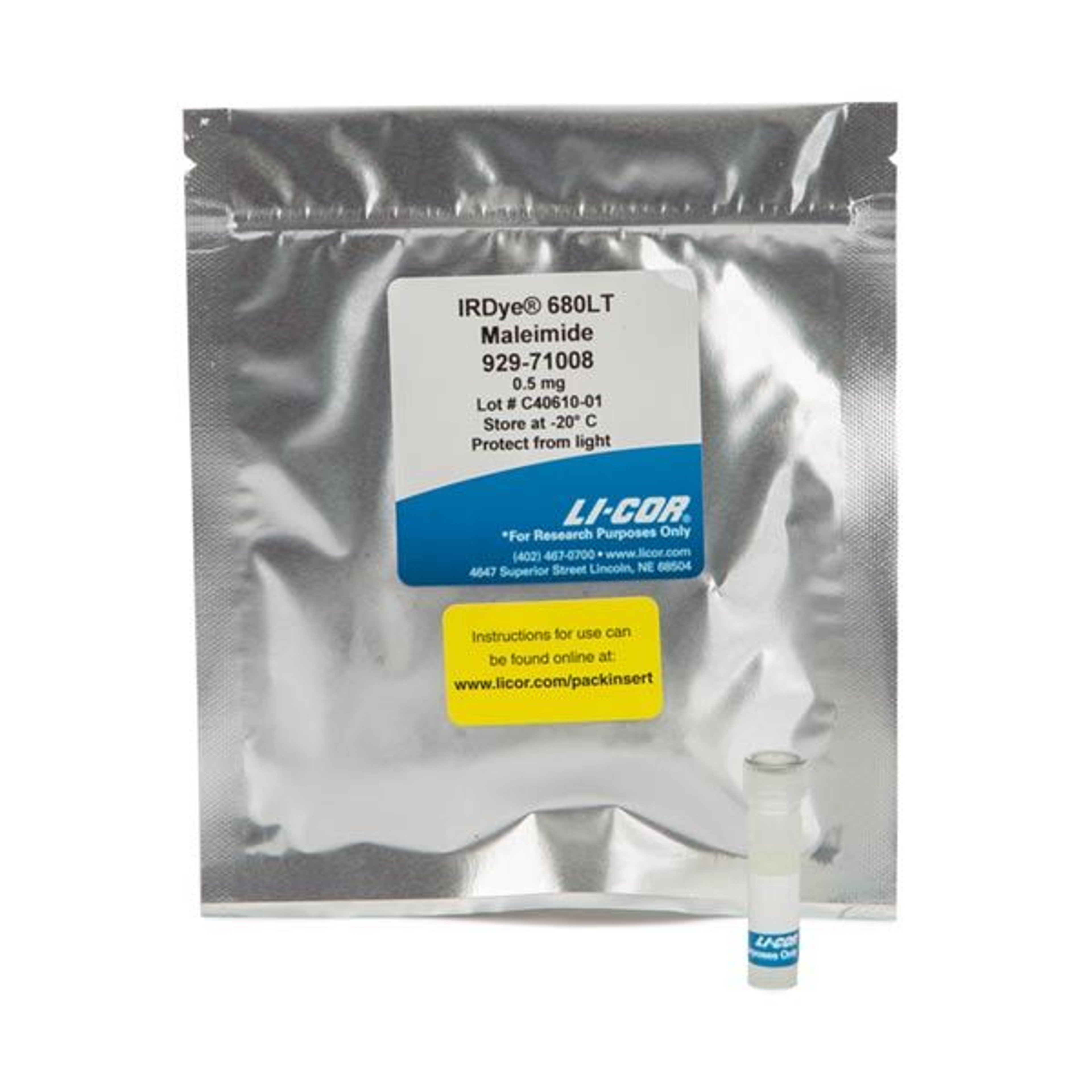 IRDye 680LT Maleimide will label molecules with free sulfhydryl (–SH) groups, such as cysteine residues in proteins. Conjugation can be performed at physiological pH.