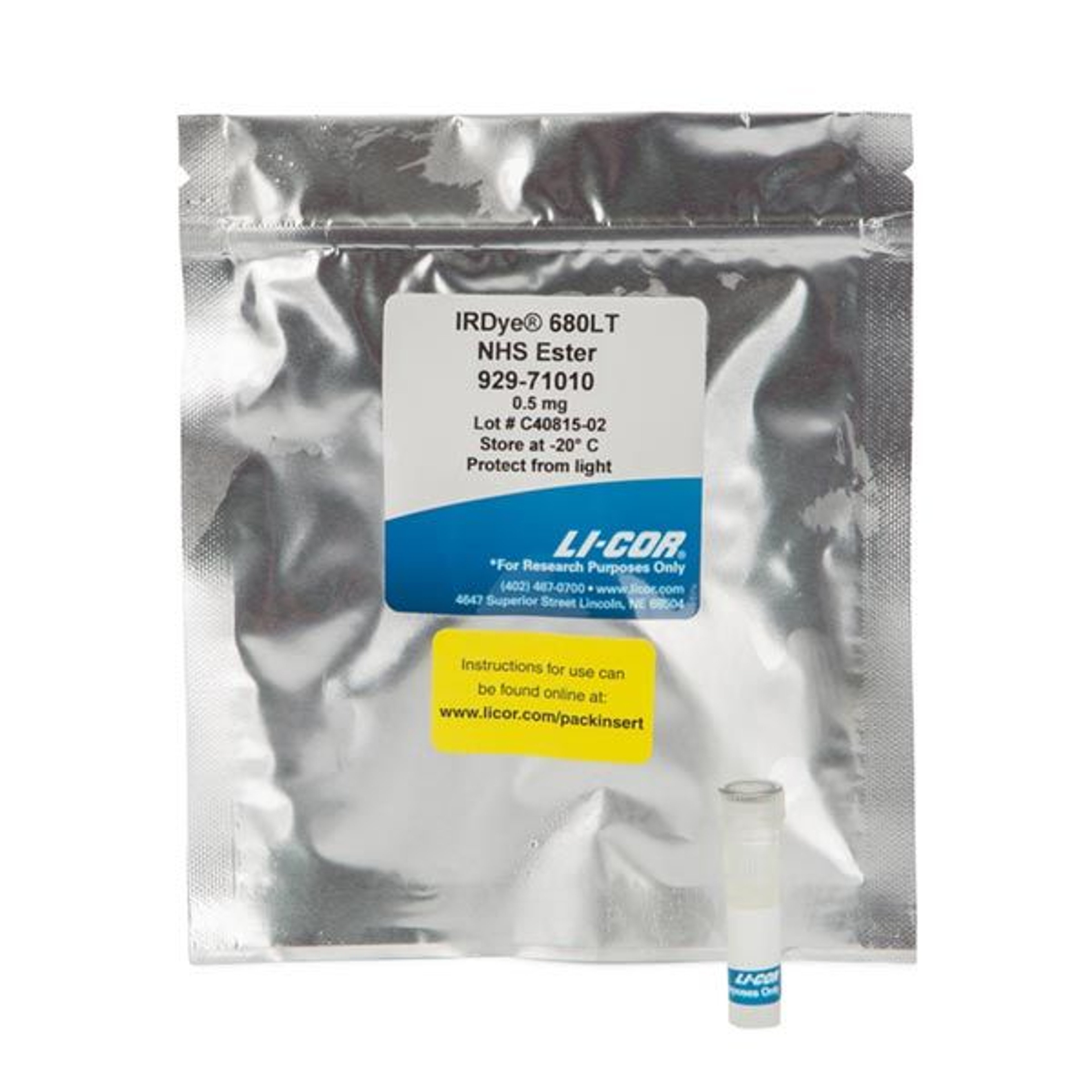 Standard NHS ester chemistry is used to produce custom probes labeled with LI-COR IRDye infrared dyes. The NHS ester reactive group provides the functionality for labeling primary and secondary amines, such as lysine residues in proteins.