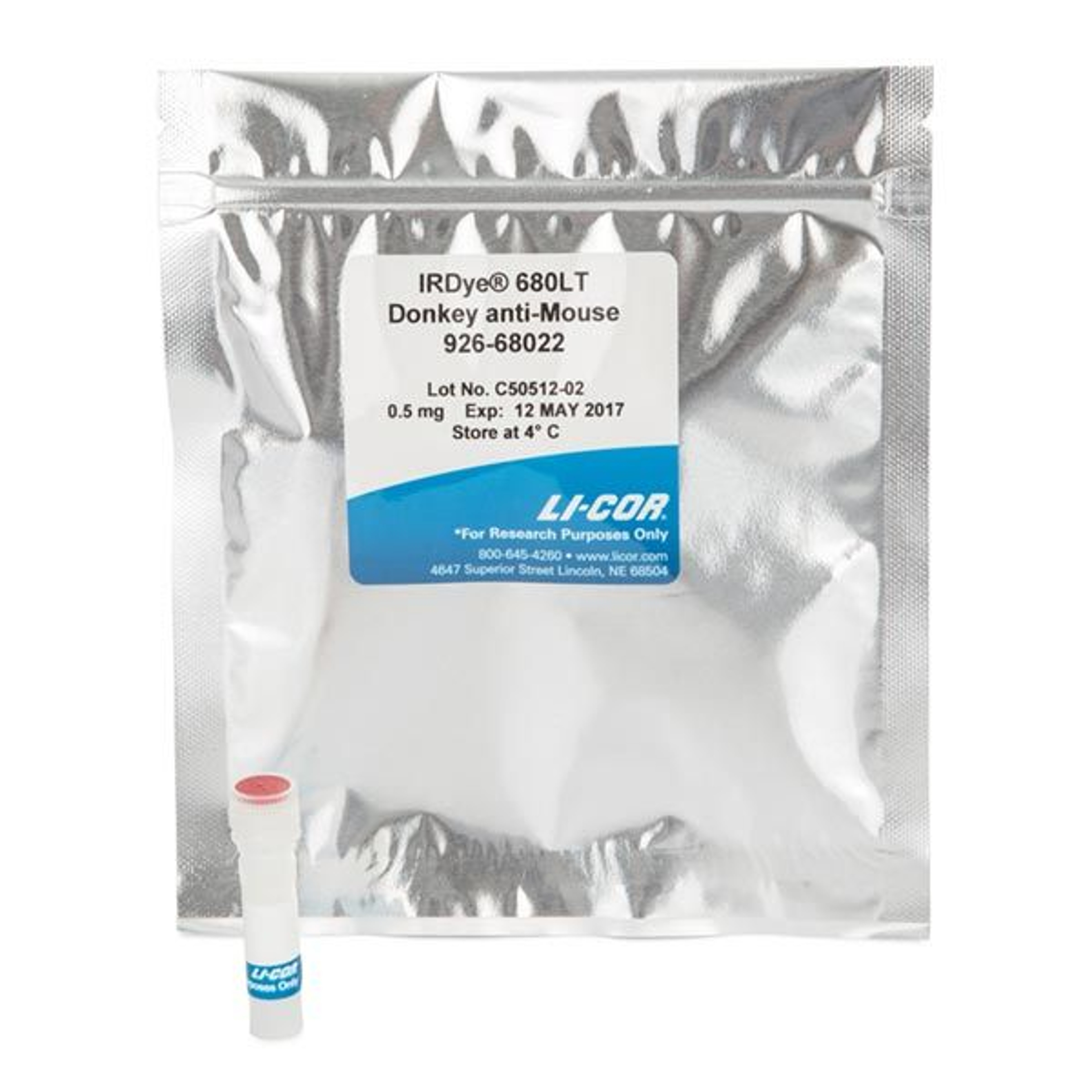 IRDye 680LT Secondary Antibodies are supplied as purified immunoglobulin conjugates, lyophilized in phosphate-buffered saline, pH 7.4. Protect from light. Store at 4 °C prior to reconstitution.
