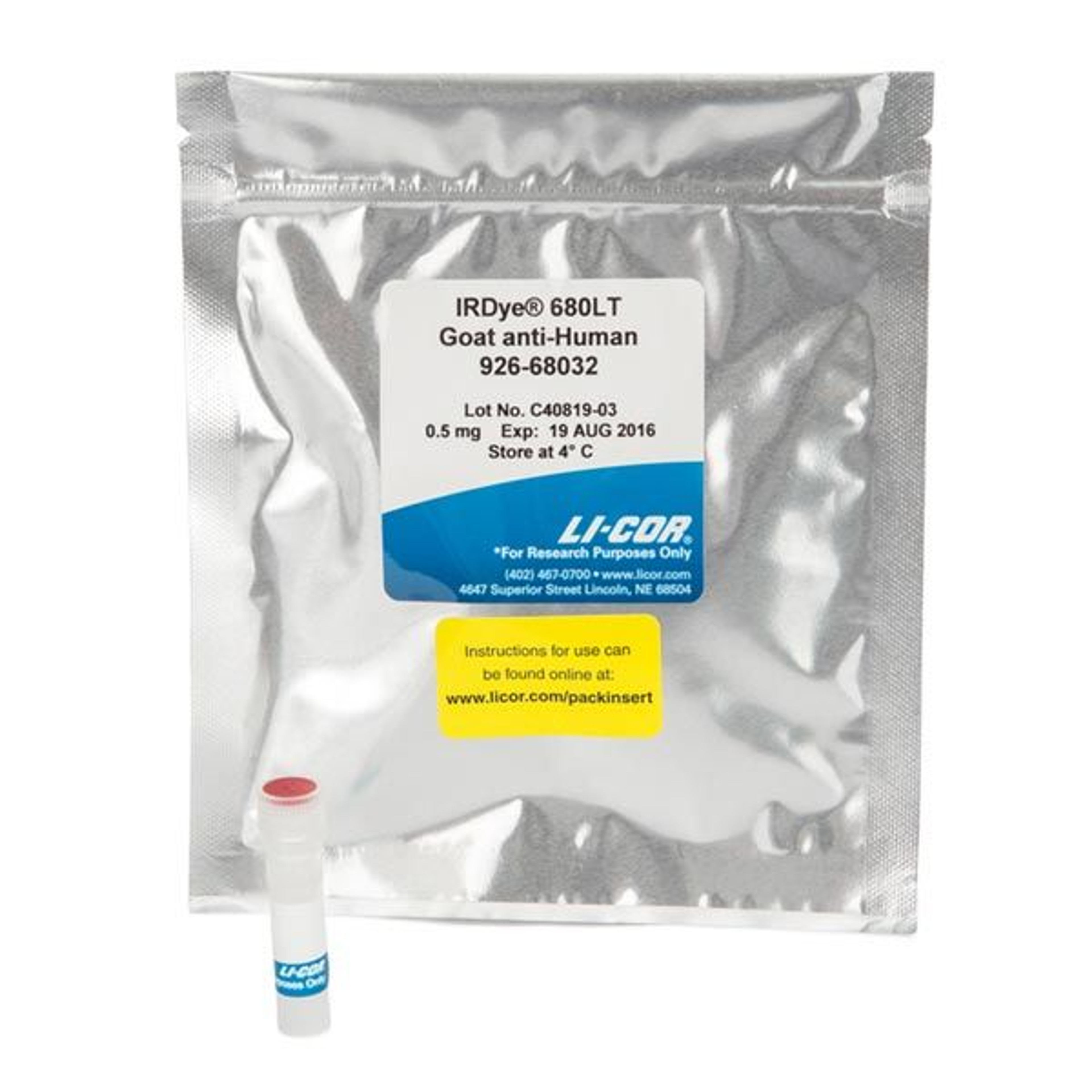 IRDye 680LT Secondary Antibodies are supplied as purified immunoglobulin conjugates, lyophilized in phosphate-buffered saline, pH 7.4. Protect from light. Store at 4 °C prior to reconstitution.