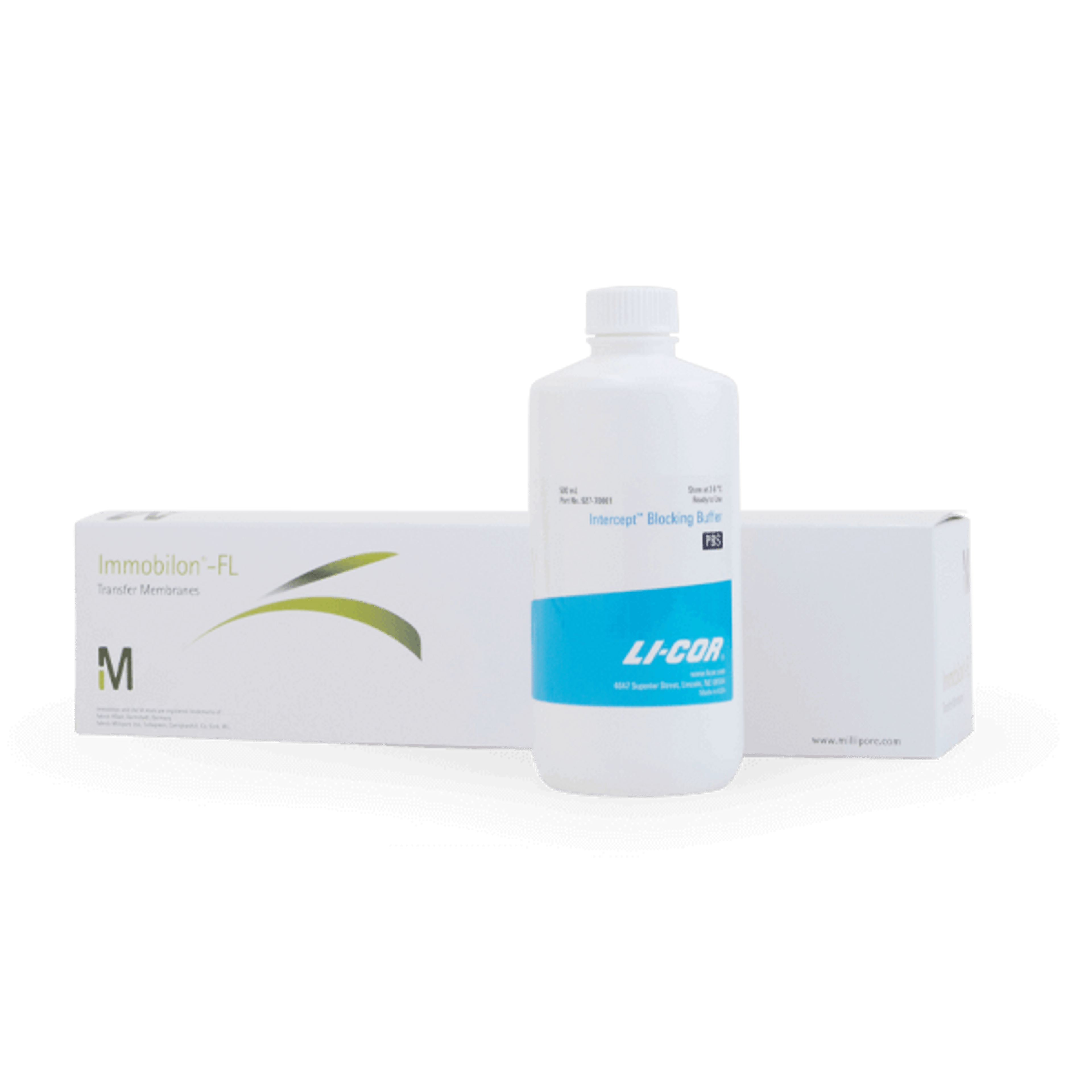 The non-mammalian Intercept® Blocker in these kits is in PBS (phosphate-buffered saline) containing 0.06% Kathon II. The Immobilon®-FL PVDF membrane included in these kits has been tested to ensure a low-background for infrared Western blot success.