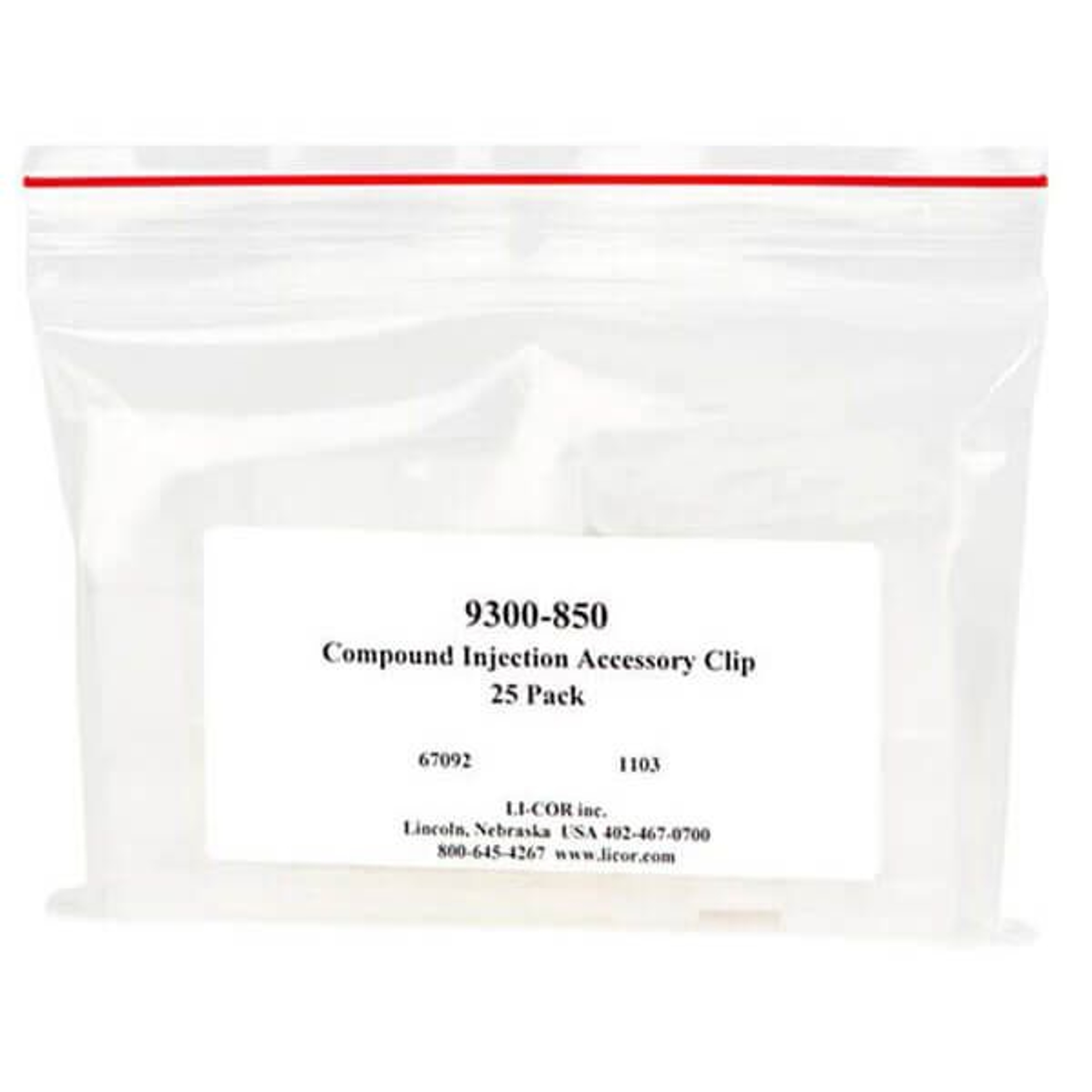 The Compound Injection Clip helps secure a syringe/catheter system for administering compounds to small animals during imaging. It attaches to the Pearl® Imaging Bed (P/N 9300-21) for easy transfer from work area to instrument.