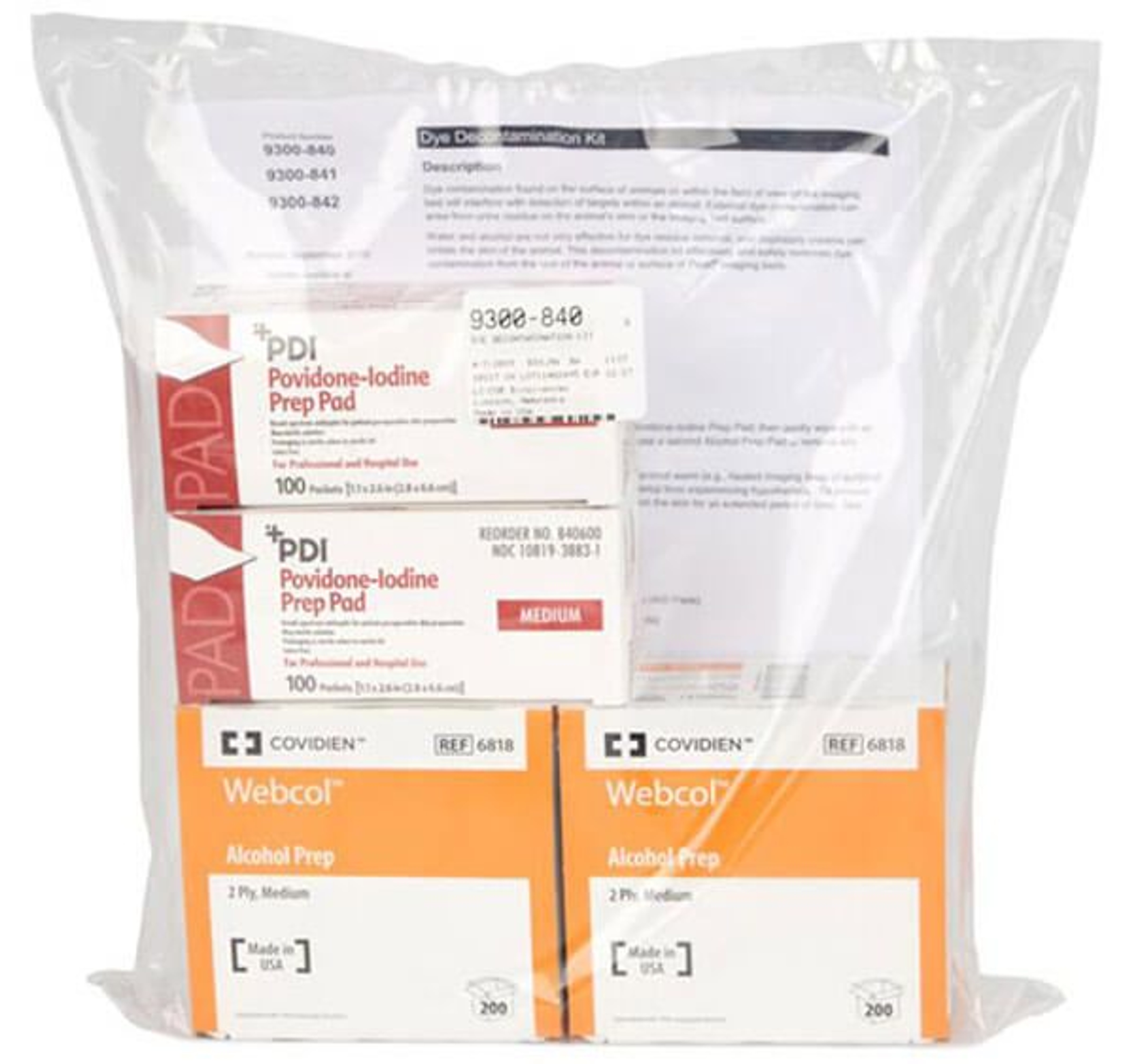 Water and alcohol are not very effective for dye residue removal, and depilatory creams can irritate the skin of the animal. This decontamination kit effectively and safely removes dye contamination from the skin of the animal or surface of the Pearl® imaging bed (P/N 9300-21).