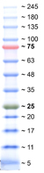 SERVA Triple Colour Protein Standard III allows for direct tracking of protein separation in the gel as well as determination of transfer efficiency in Western blotting and estimation of protein sizes. The protein marker covers a broad molecular weight range from 5 to 245 kDa (13 bands, separation in SDS Tris-Glycine gel). The proteins are covalently labelled with a blue dye, with the exception of the green-stained 25 kDa and red-stained 75 kDa reference bands. The red fluorescent marker proteins allow the use of the marker in fluorescence Western blot systems (e.g., Odyssey® Imagers). The standard is ready to use, as no reconstitution or dilution is necessary. No refrigerated transport is necessary, and it is stable for up to 2 weeks at 25 °C and up to 3 months at +4 °C. Recommended application volume for a mini gel is 3–5 µl/track.