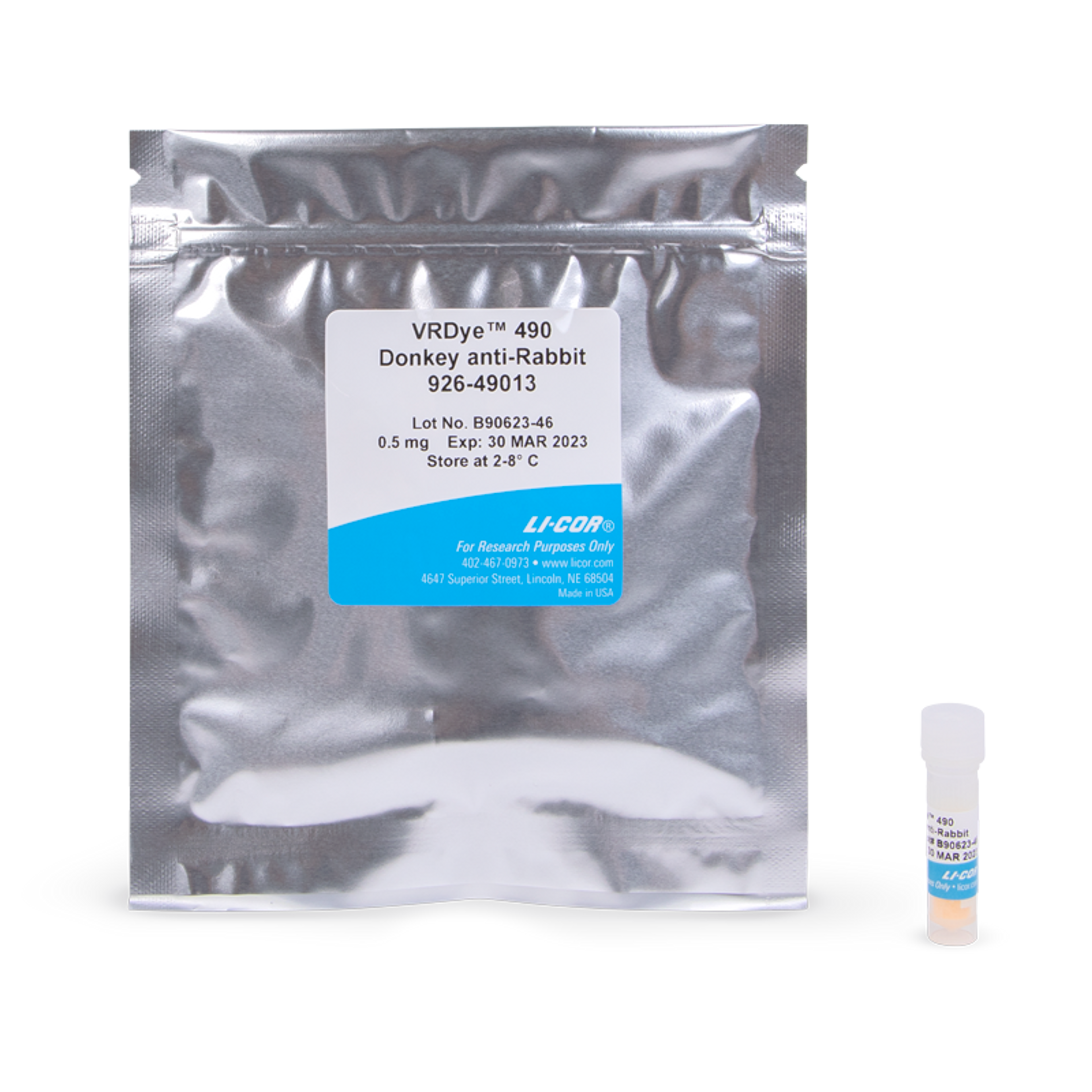VRDye 490 secondary antibodies are supplied as purified immunoglobulin conjugates, lyophilized in phosphate-buffered saline, pH 7.4. Protect from light. Store at 4 °C prior to reconstitution.