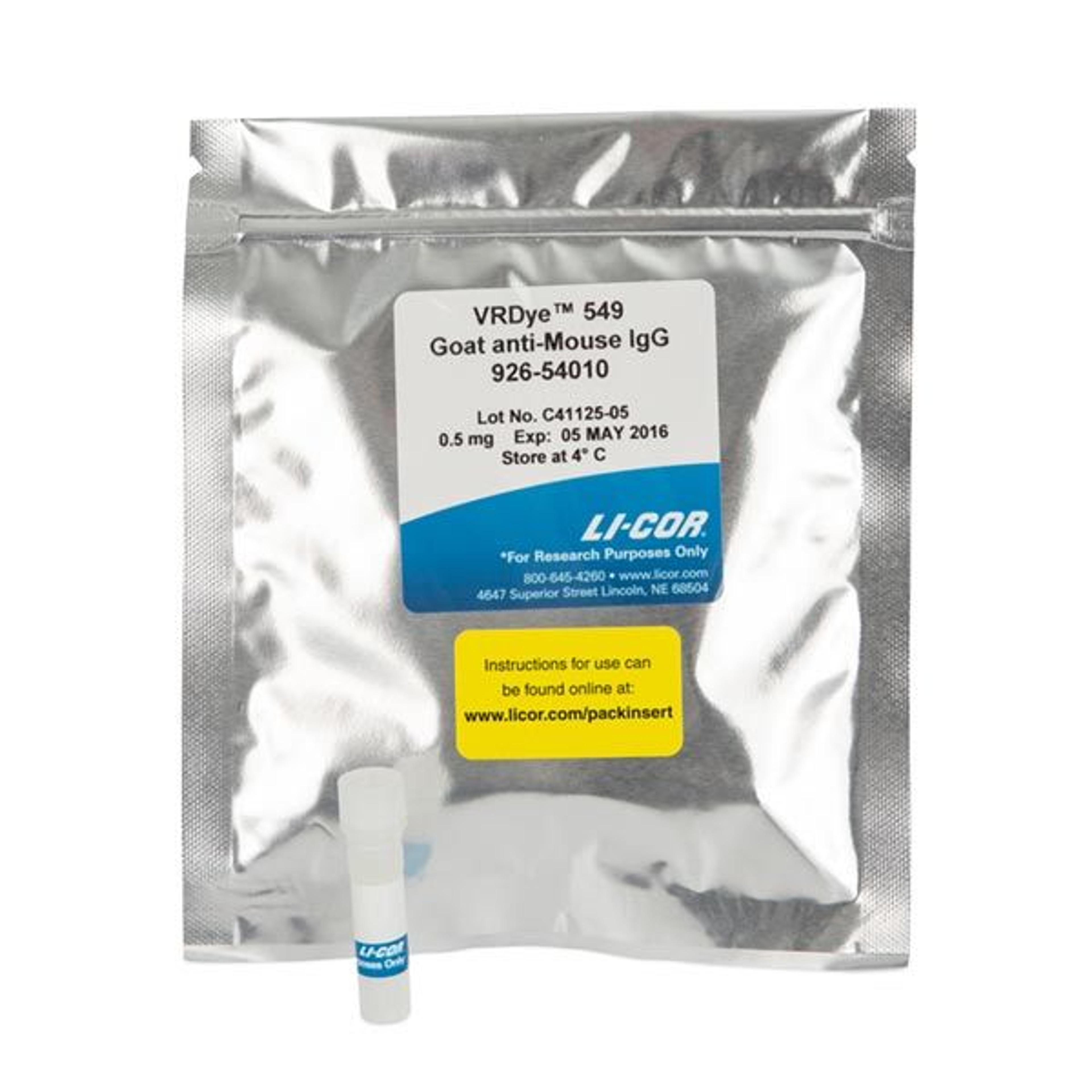 VRDye 549 secondary antibodies are supplied as purified immunoglobulin conjugates, lyophilized in phosphate-buffered saline, pH 7.4. Protect from light. Store at 4 °C prior to reconstitution.